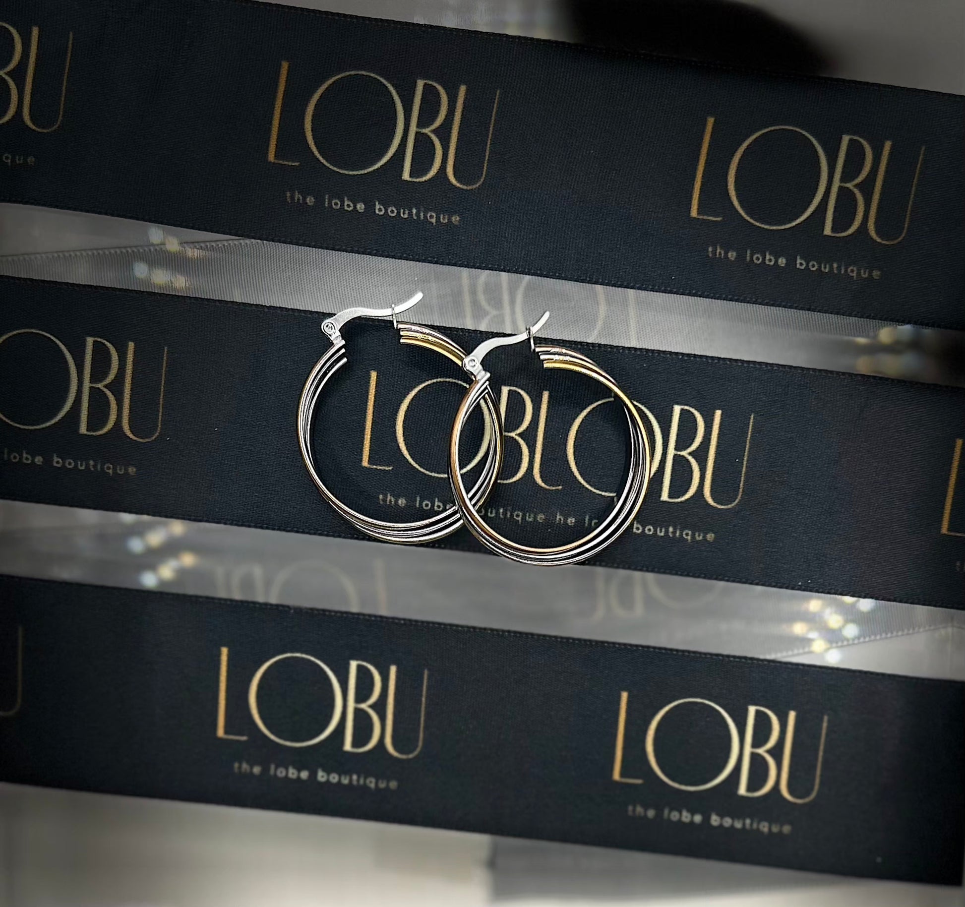 Small, sturdy and stainless steel - these tri-colored hoops feature a gold, silver and rose gold layer for a layered look.
